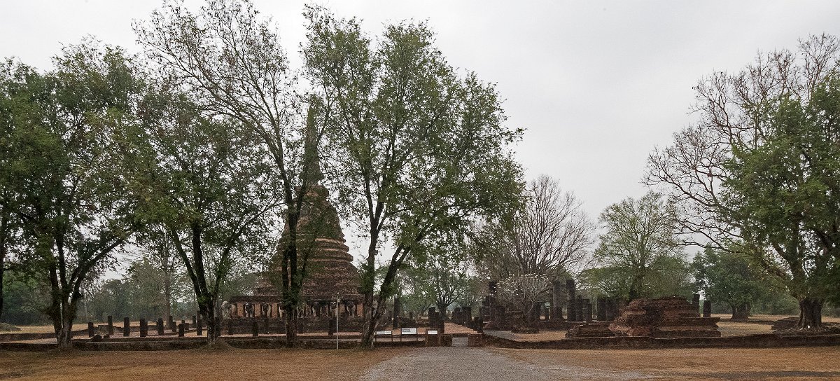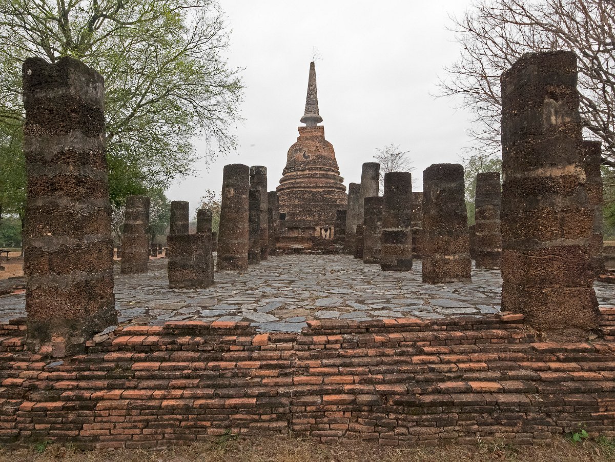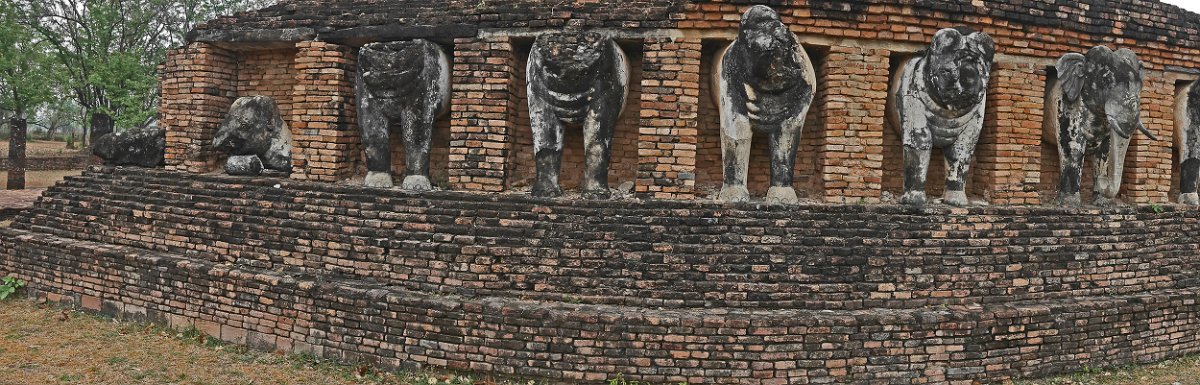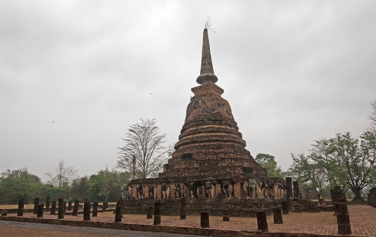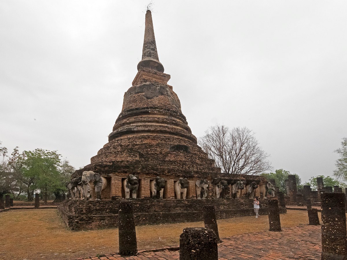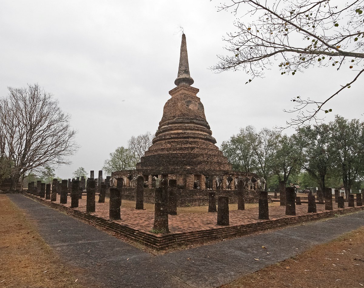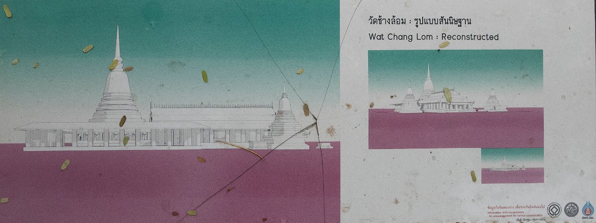 Le Wat Chang Lom se caractérise par son imposant chedi cinghalais. Tout au long de sa base carrée court une impressionnante rangée d'éléphants, d'où le nom de ce temple signifiant « entouré d'éléphants ». Il s'agit de la représentation des pachydermes célestes de la mythologie indienne qui portent sur leur dos l'univers en forme de voûte. Ce chedi se tient au centre du temple, construit au 15e s., comme l'ont révélé les fouilles archéologiques.
