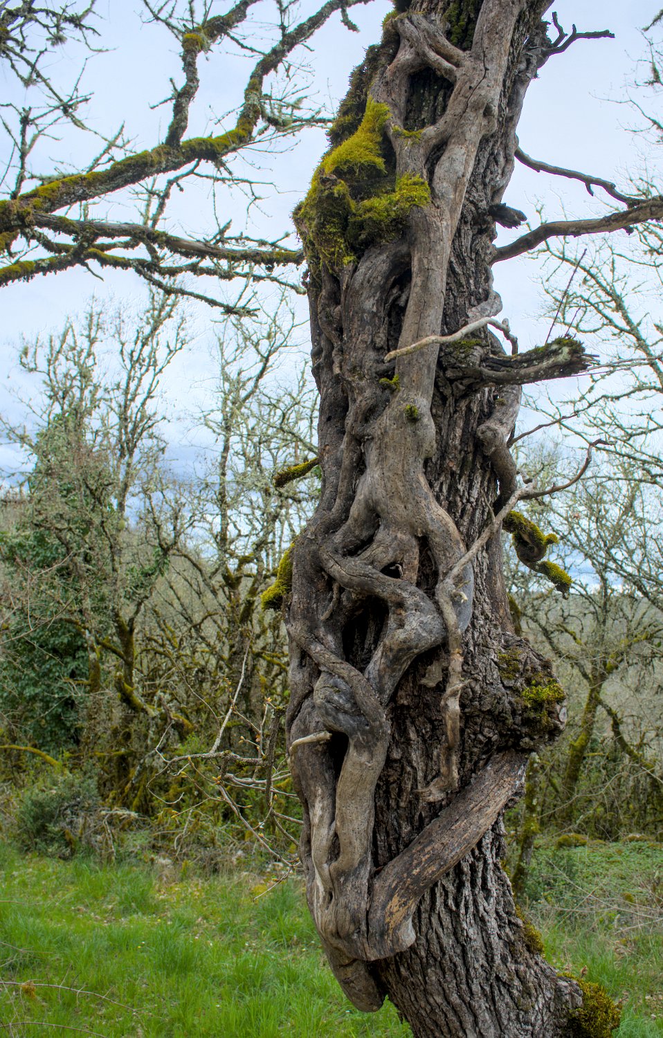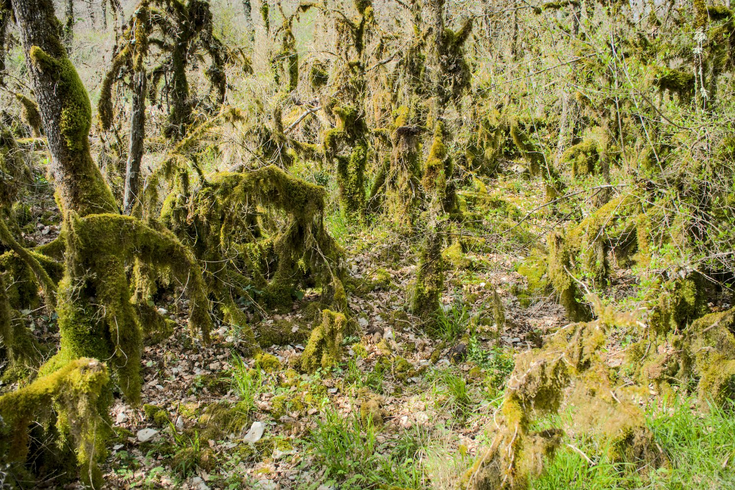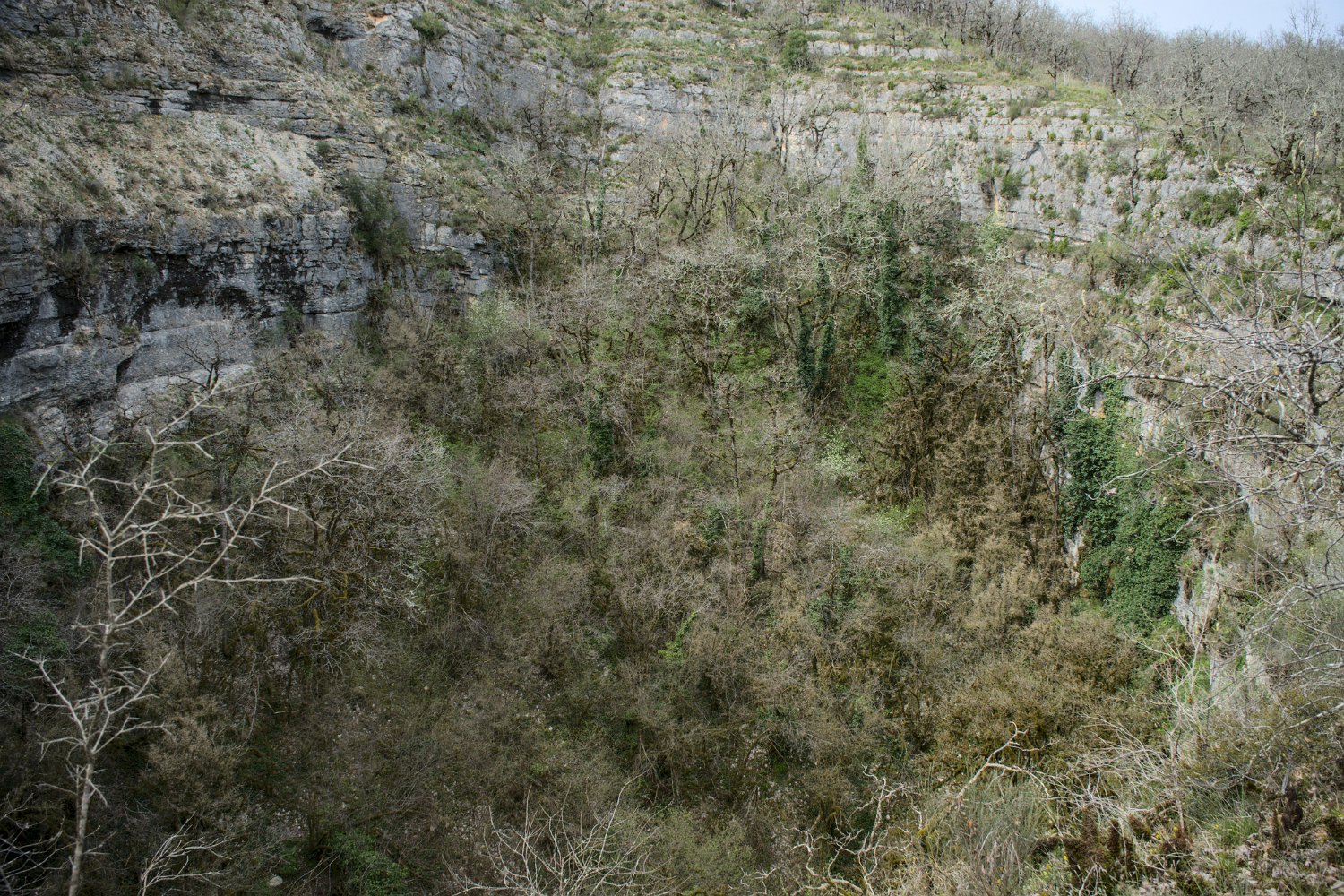Vue sur l'igue  Un igue est une sorte de puits naturel, en général pas très large, provoqué soit par une cavité karstique remontant jusqu'au niveau du sol , soit par un effondrement du sol au-dessus d'une cavité karstique. Vue sur l'igue Vue sur l'igue Narcisse Mousses sur les arbustes  Une présence importante de mousse sur la base des ligneux en sous-bois est  liée  à l’humidité  de l’automne au printemps due à l'effet de confinement (Brouillards…)