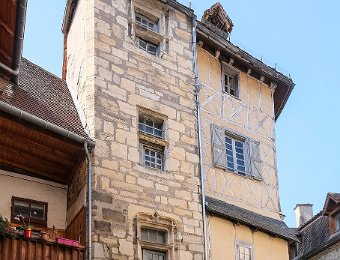 La place de la Bridolle. Maison du XVè siècle au fond et Abbatiale Saint-Pierre à droite