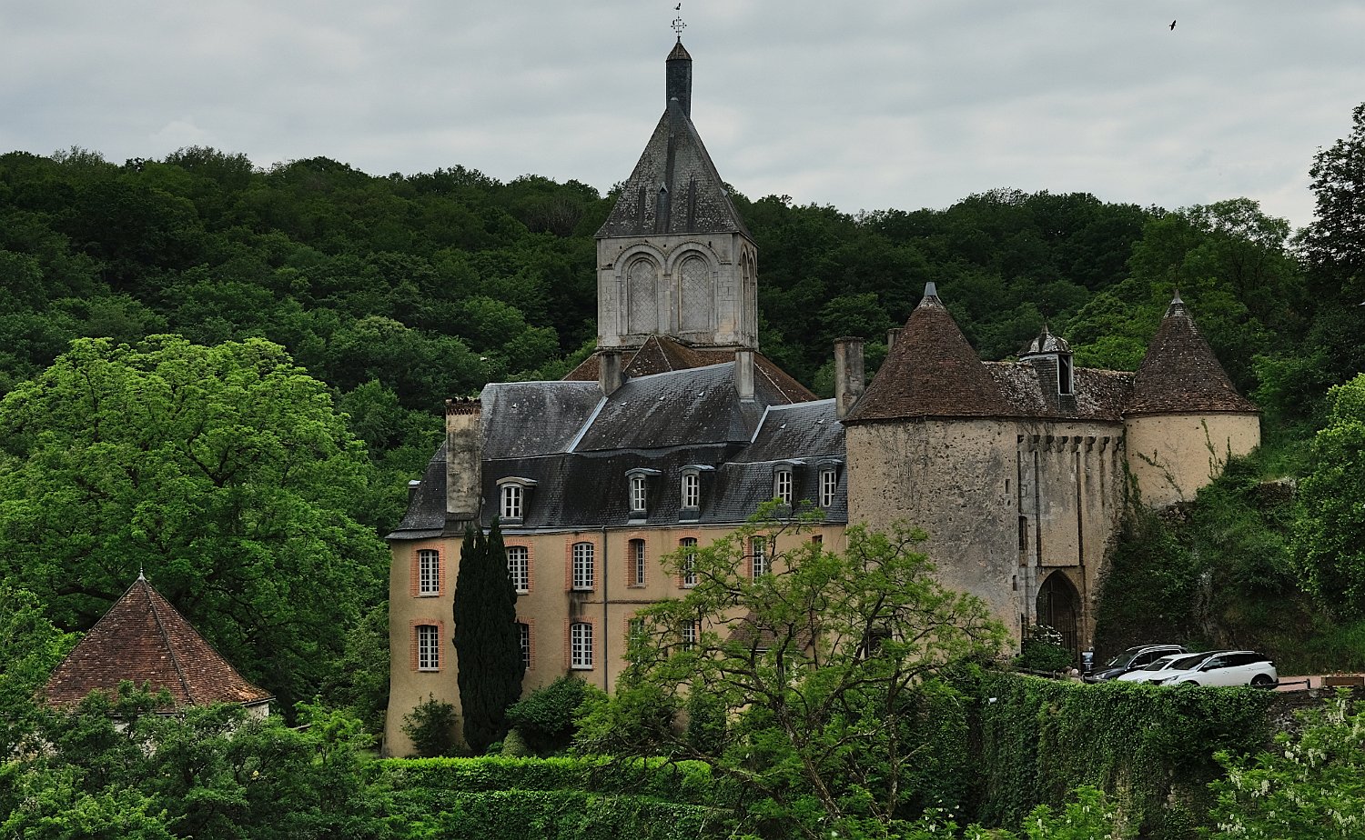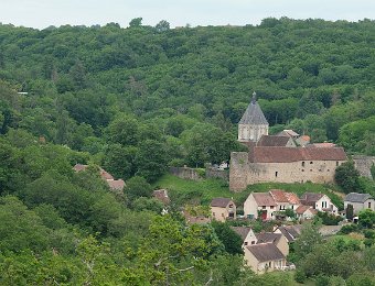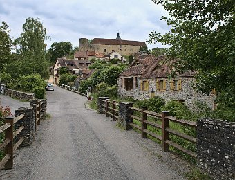 Vue du village- En haut le pigeonnier, rempart et bâtiments du château