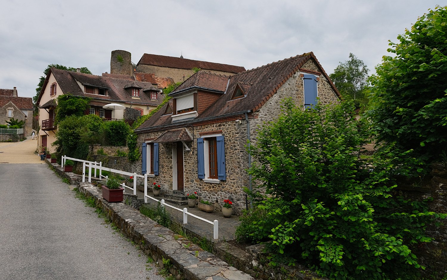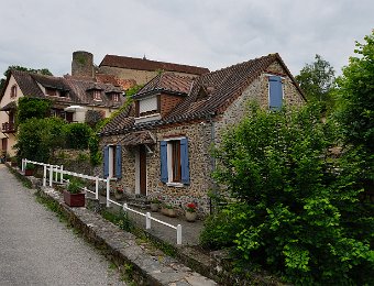 Maisons construites sur la falaise qui surplombe la rivière Gargilesse, affluent de la Creuse