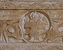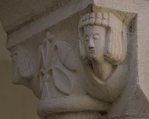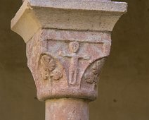 Chapiteau représentant l'abbé du monastère en procession (côté droit) et un ange sous un dai tenant un livre et un crucifix (côté gauche)