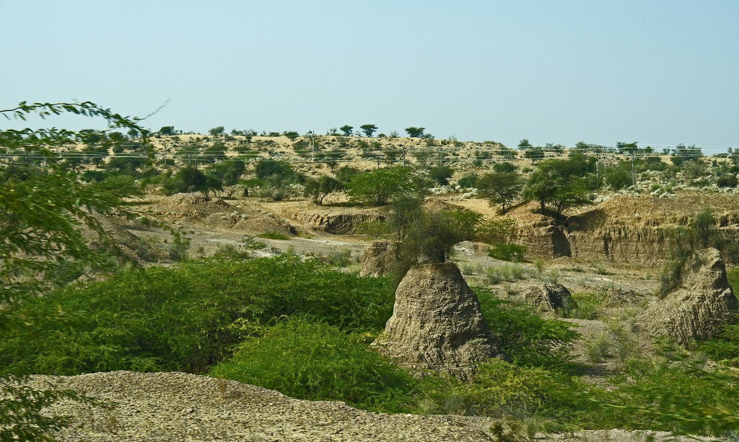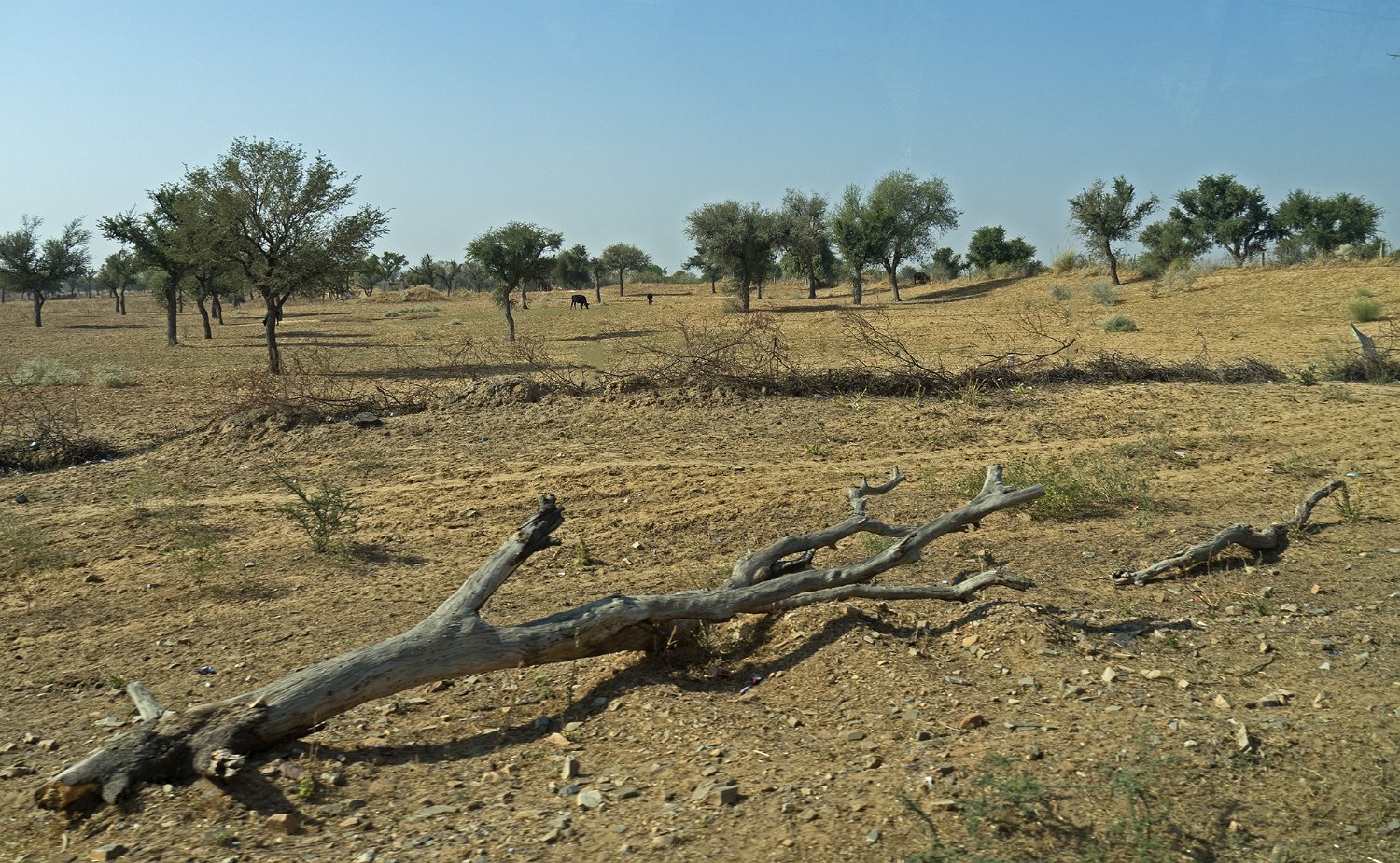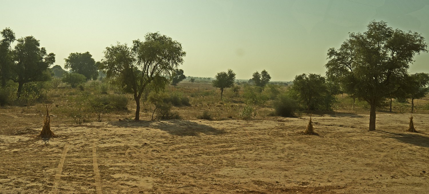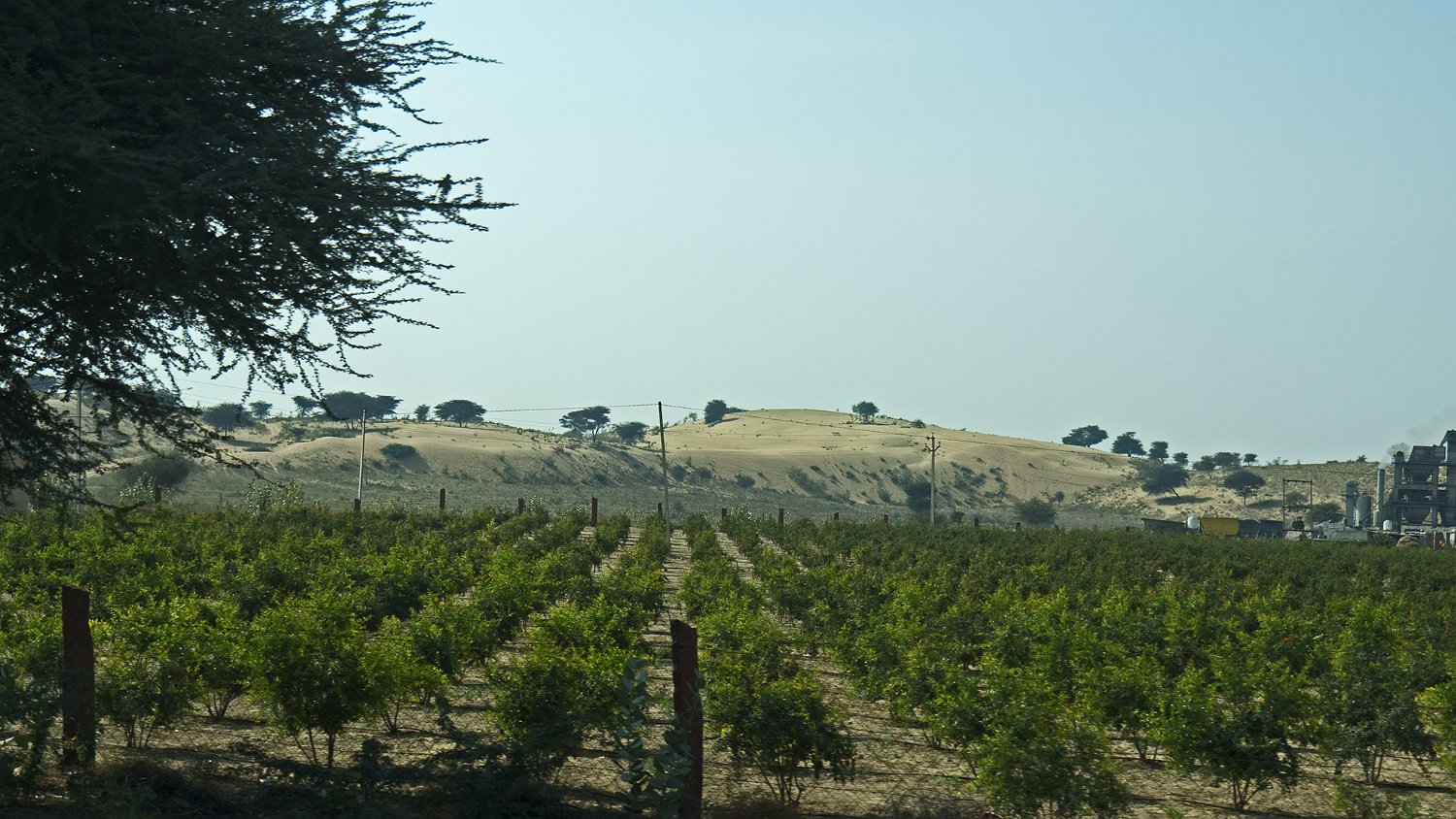 Désert du Thar- végétation typique Paysage agricole (agrumes) en bordure du désert du Thar  Le canal Indira Gandhi a permi de développer une agriculture productive dans le désert du Thar. Il est alimenté par l'eau de fleuves de l'Himalaya. Il fait 470 km de long. Désert du Thar- parachute ascensionnel Désert du Thar- Ancienne exploitation de matériaux  Les arbres et arbustes ont été préservés...
