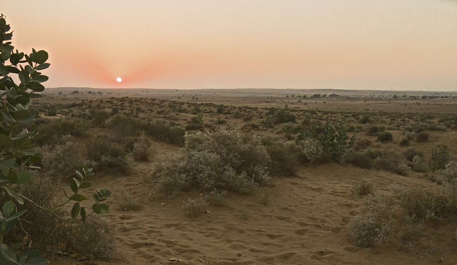 Désert du Thar  Le désert du Thar s'étend au Rajasthan, à l’extrême nord-ouest de l’Inde dont il couvre environ 200 000 km2 de la surface. Il  a la particularité d'être assez densément peuplé par rapport aux autres déserts, notamment avec deux grandes villes qui s'y sont développées, Bikaner et Jaisalmer. Il est recouvert de sable et de rocailles parsemés d'arbustes. Il reçoit moins de 200 mm d’eau par an. Désert du Thar au petit matin Désert du Thar au petit matin Désert du Thar au coucher du soleil