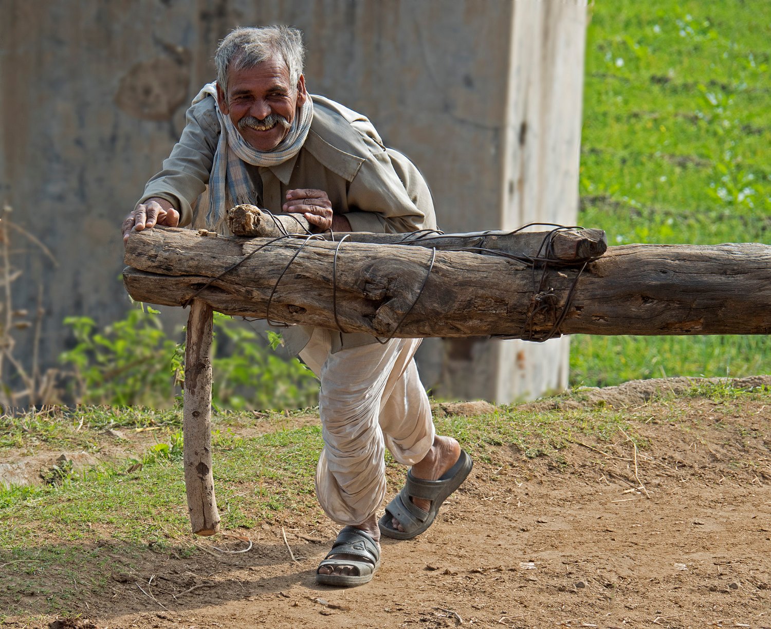 55Agriculteur montrant le fonctionnement de sa noria sur la route entre Ranakpur et Udaipur