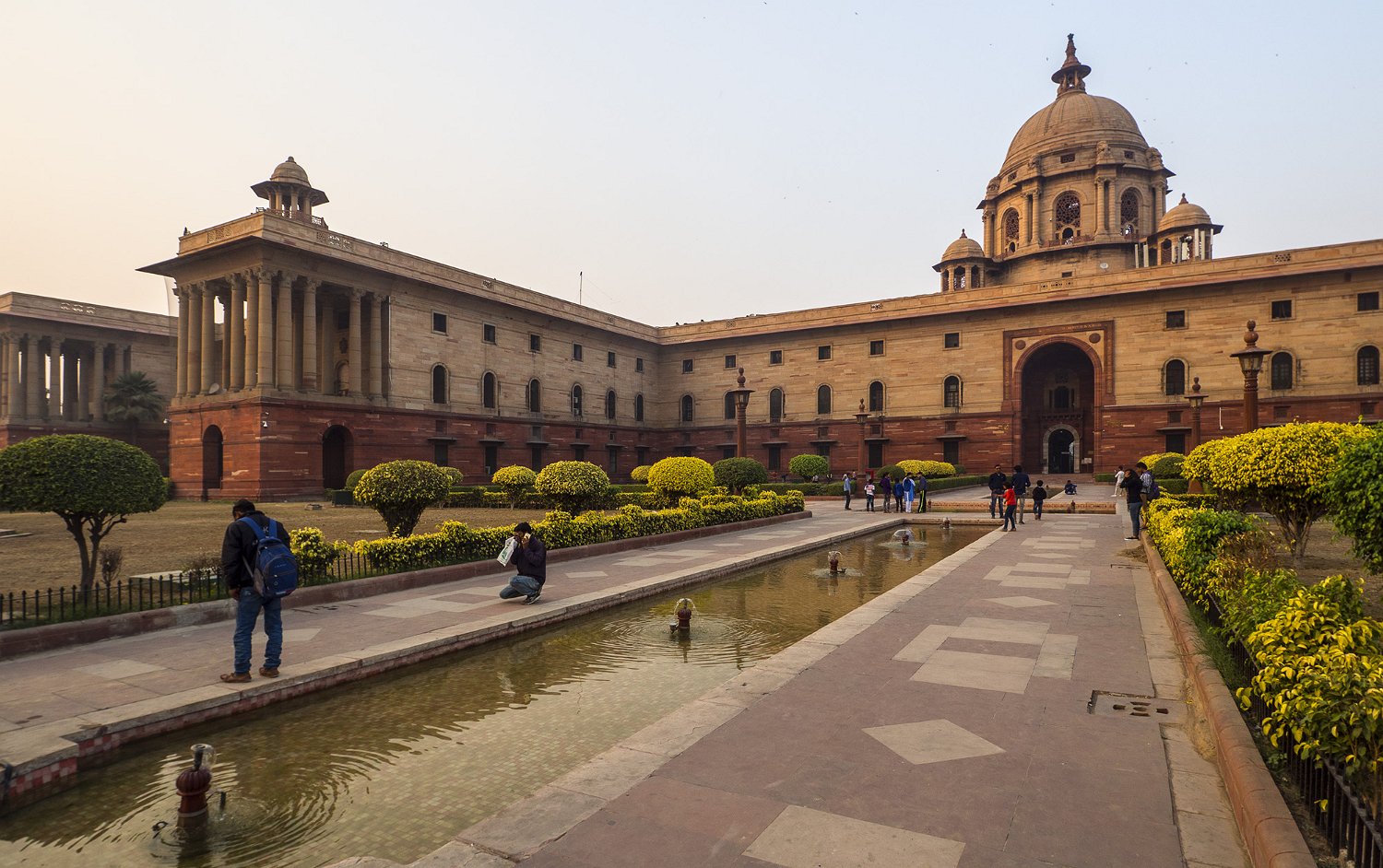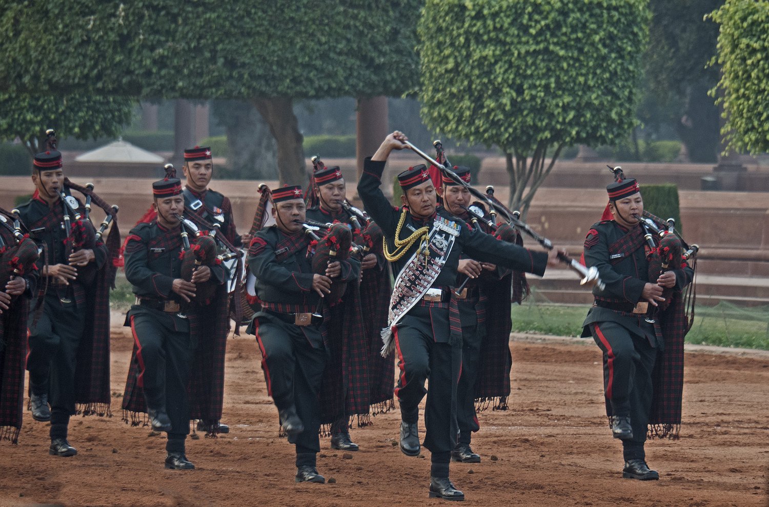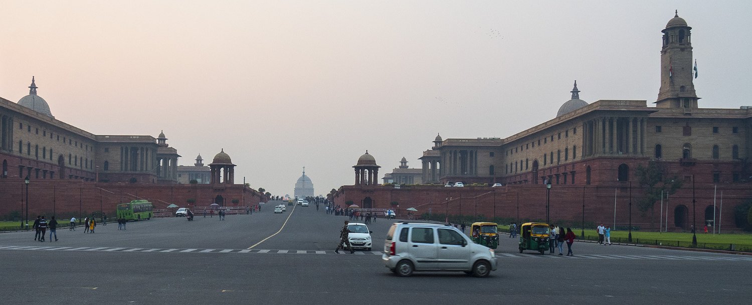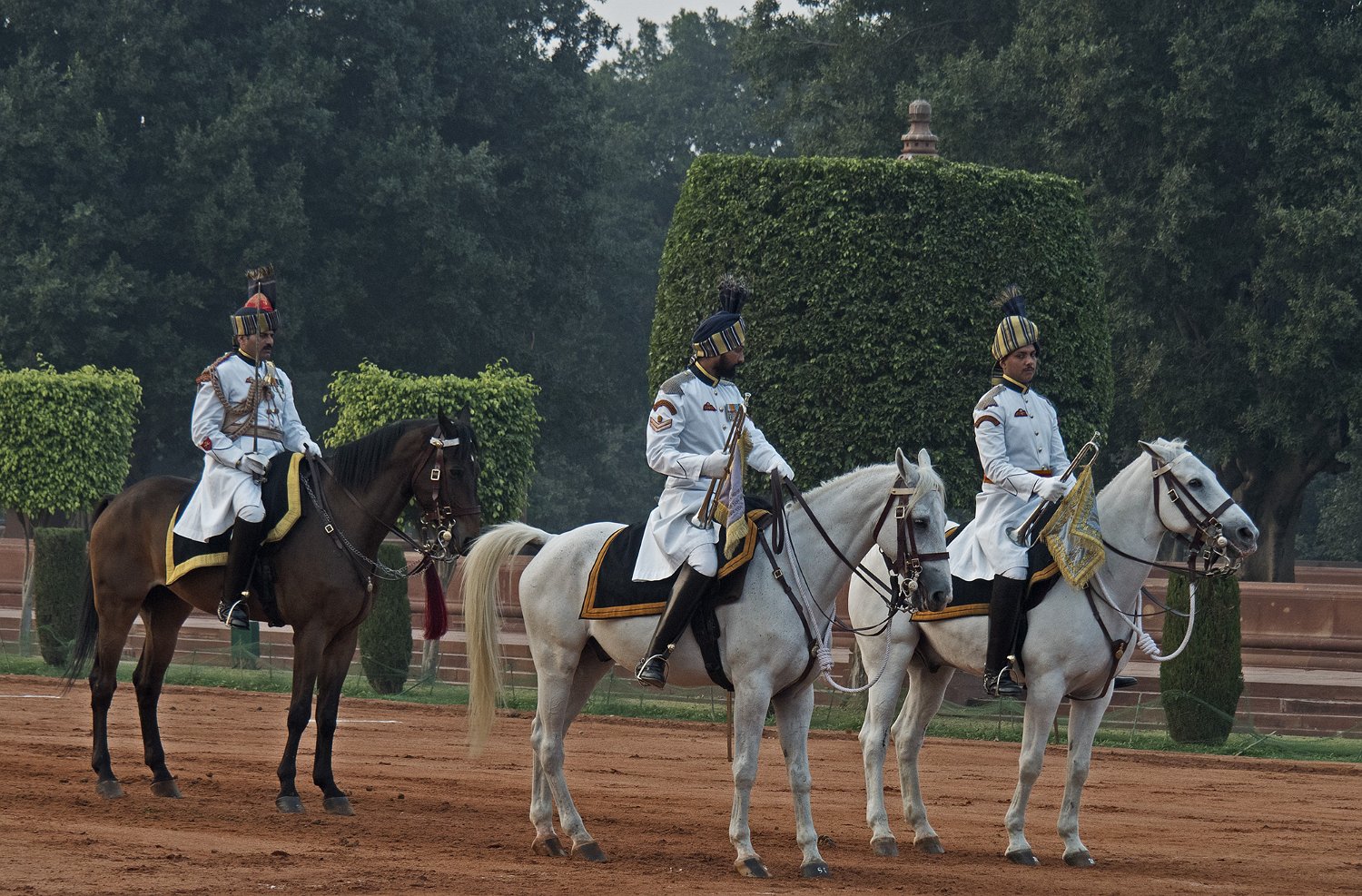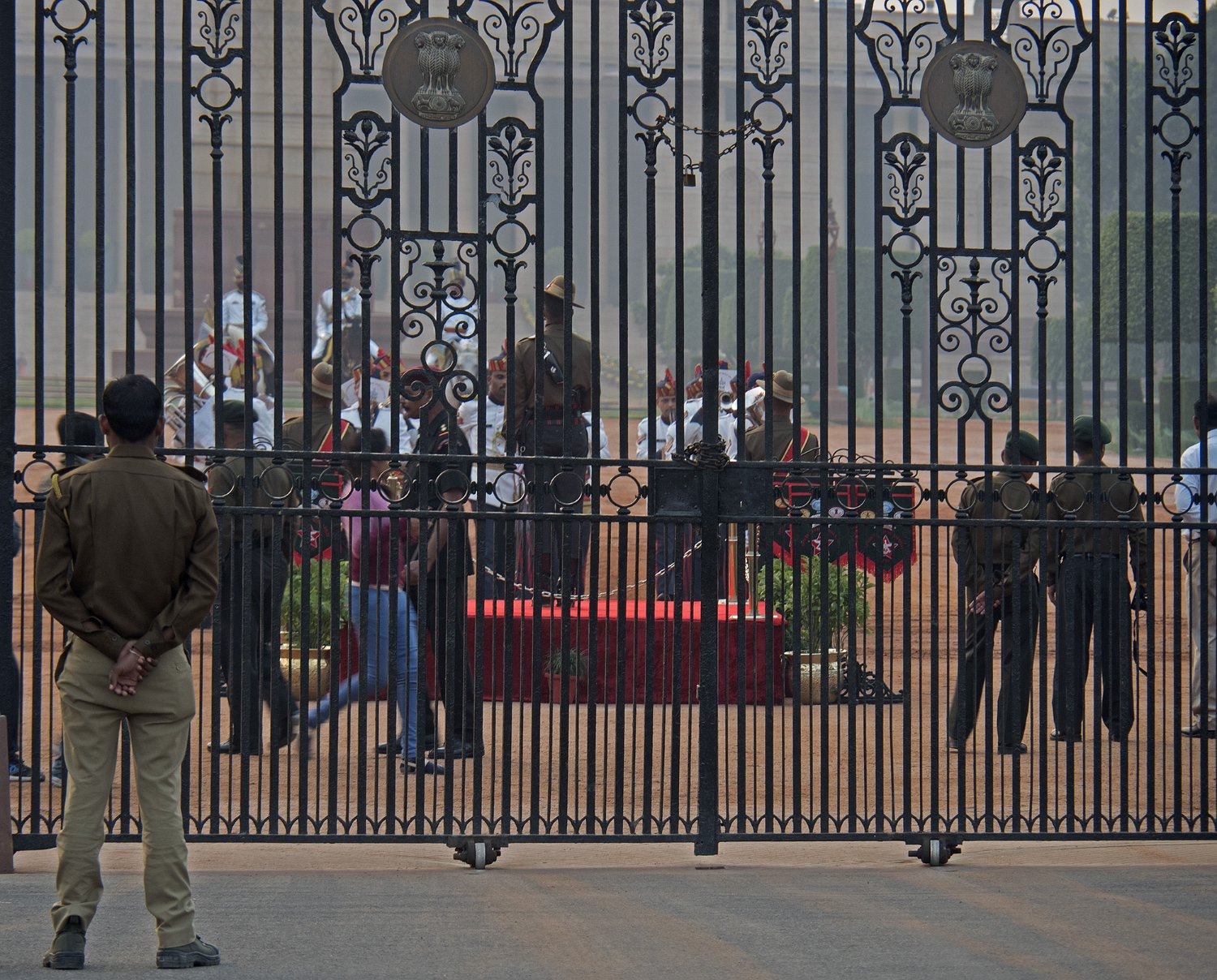 Palais du gouvernement Avenue dans New Delhi et au fond l'arc de triomphe vu à travers la pollution Parade militaire dans New Delhi  Ces parades militaires ont lieu tous les dimances après midi dans le Buddha Javanti Park de New Delhi Parade militaire dans New Delhi