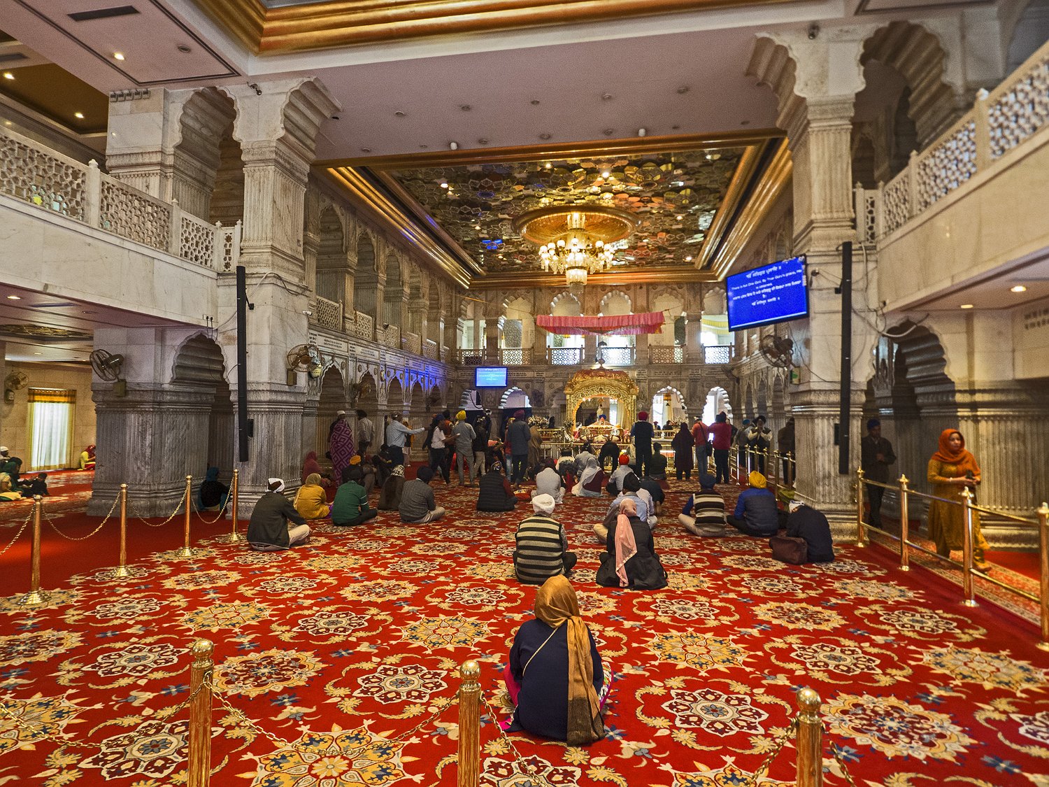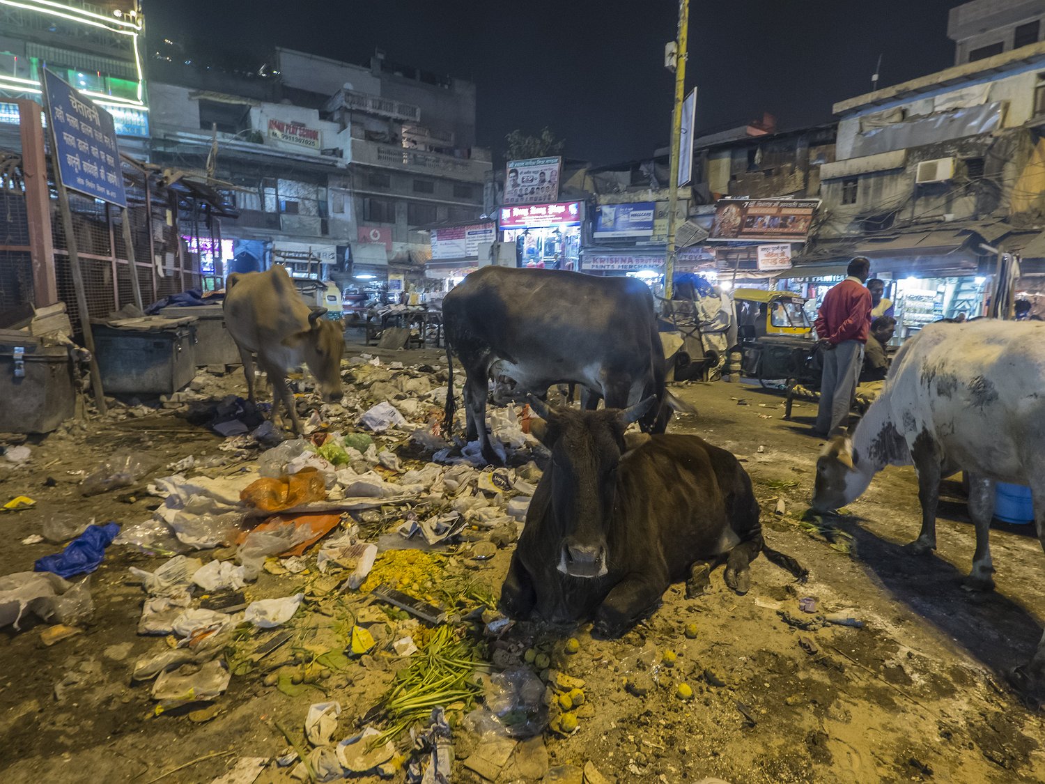 Rue de nuit dans Old Delhi Vaches dans Old Delhi  Voir aussi l'album photo sur les vaches sacrées (http://inde.vaches-sacrees.af24.fr) : vache Old Delhi- Menuiserie à ciel ouvert Gurdwara Bangla Sahib (temple Sikh)  Ce temple Sikh réalise 25000 repas par jour qui sont distribués sans aucune considération d'origine ou de caste. A l'heure des repas, les fidèles s'assoient par terre en rangées, et des volontaires leur servent dal et chapati. Ce repas commun symbolise l'unité de la communauté.