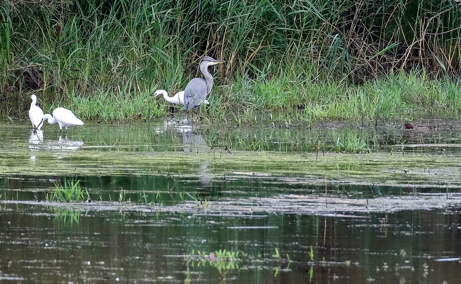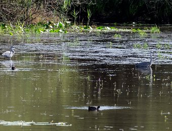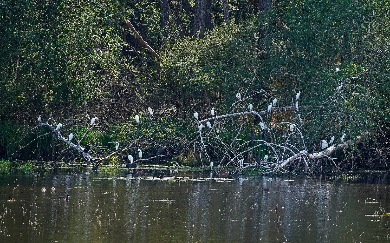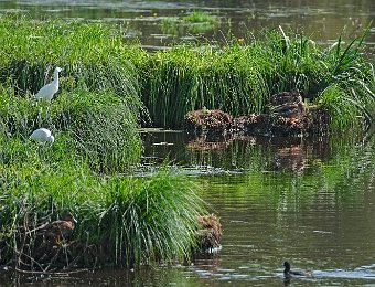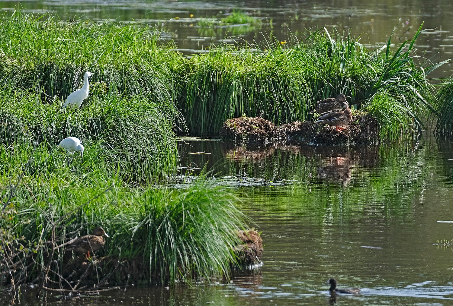 Paysage typique de l'étang (aigrettes, canards souchets et foulque macroule)