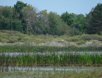 Vue du fond de l'étang. On distingue la héronnière peuplée d' aigrettes garzettes