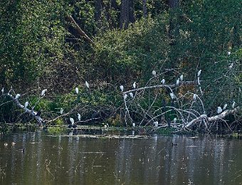 La héronnière. Les oiseaux noirs sont des grands cormorans