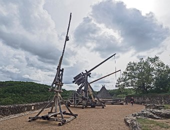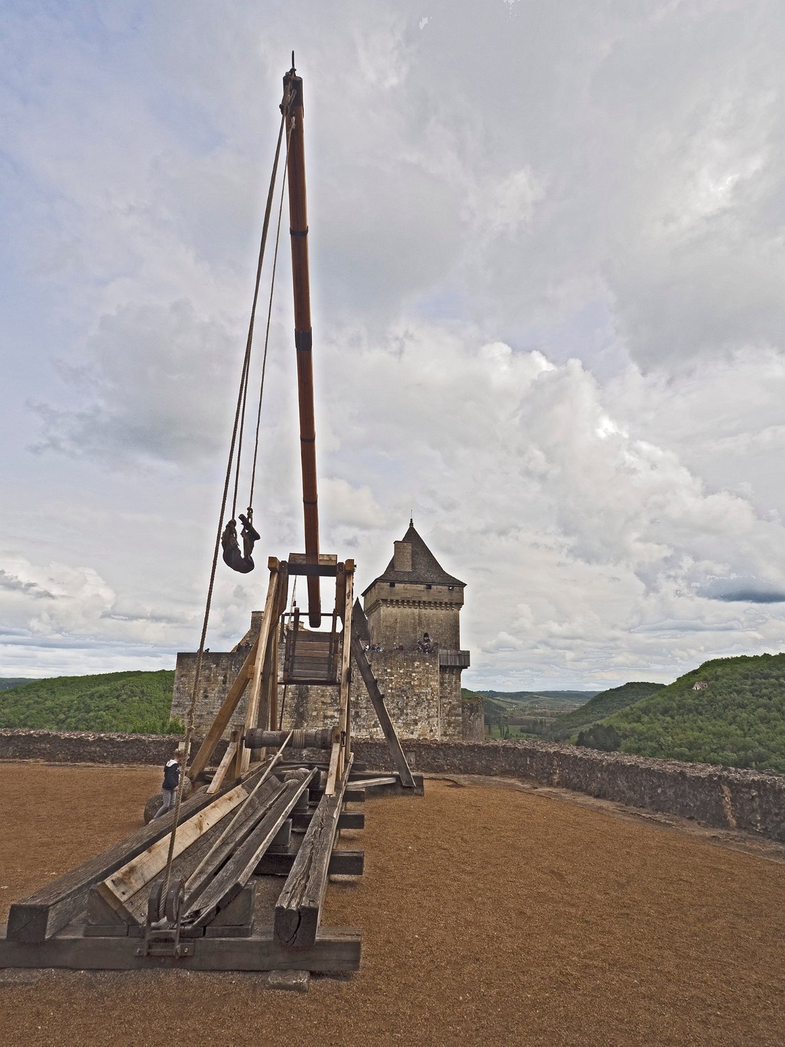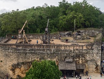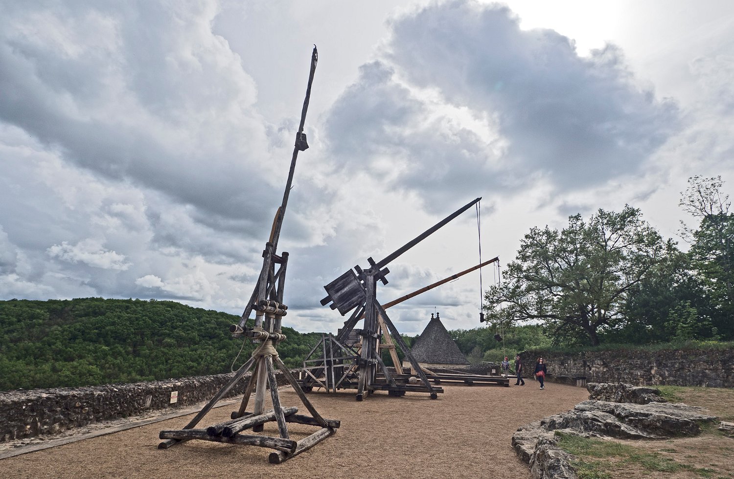 Sur le bastion- A partir du 1er plan : Perrière, mangonneau, trébuchet