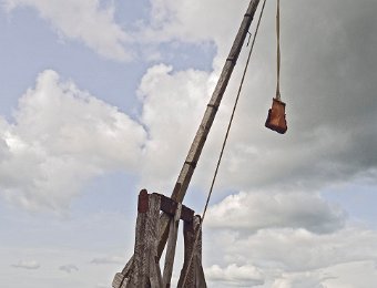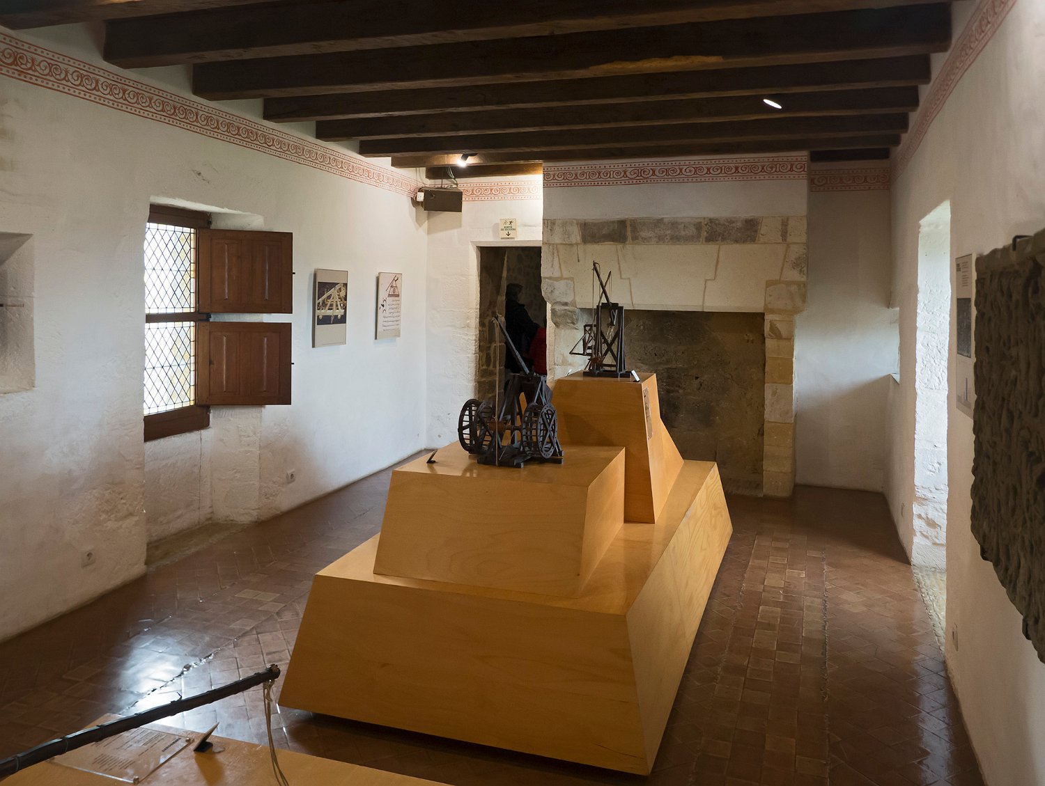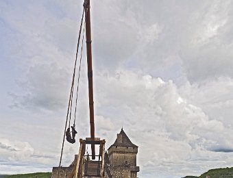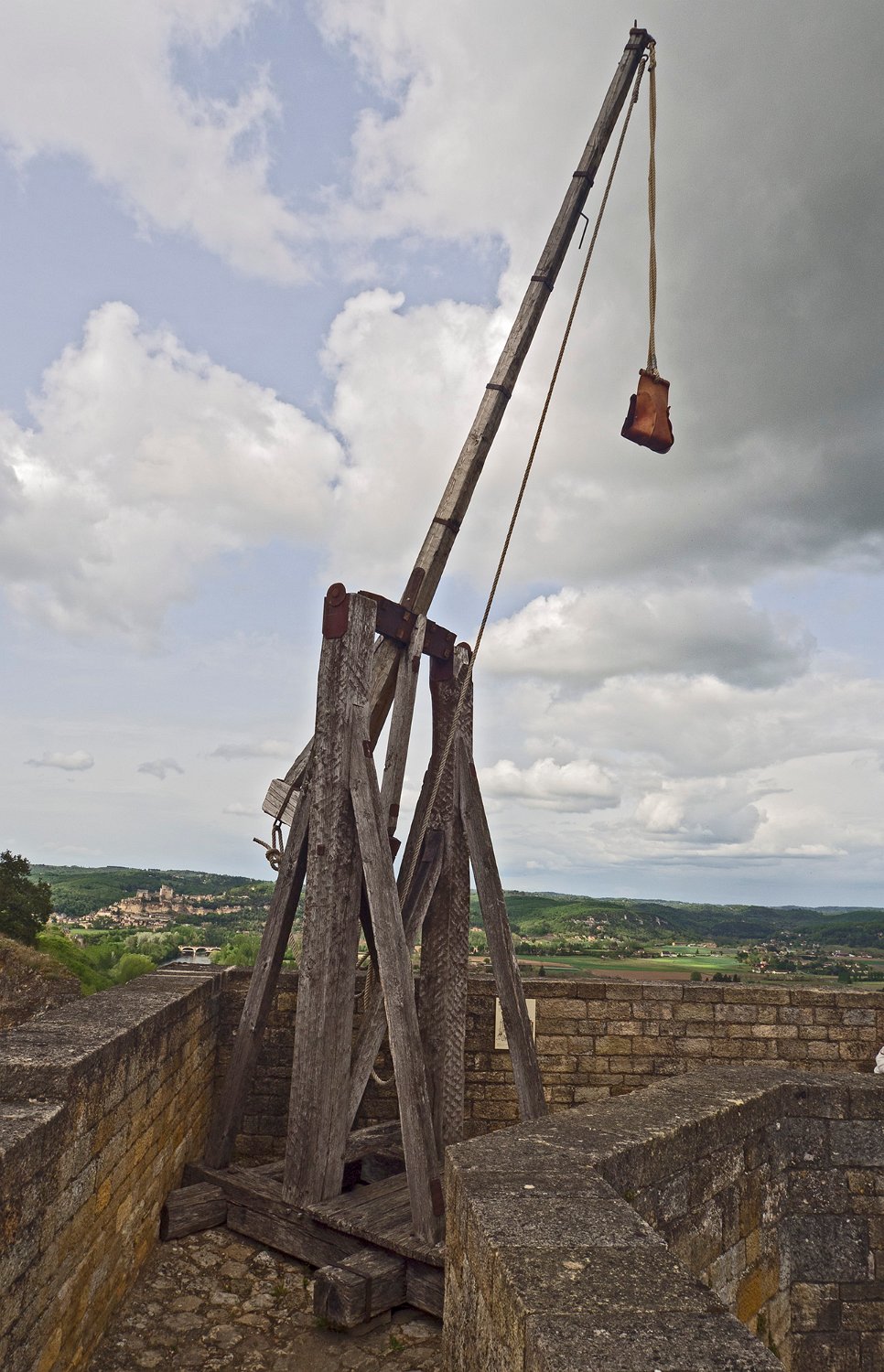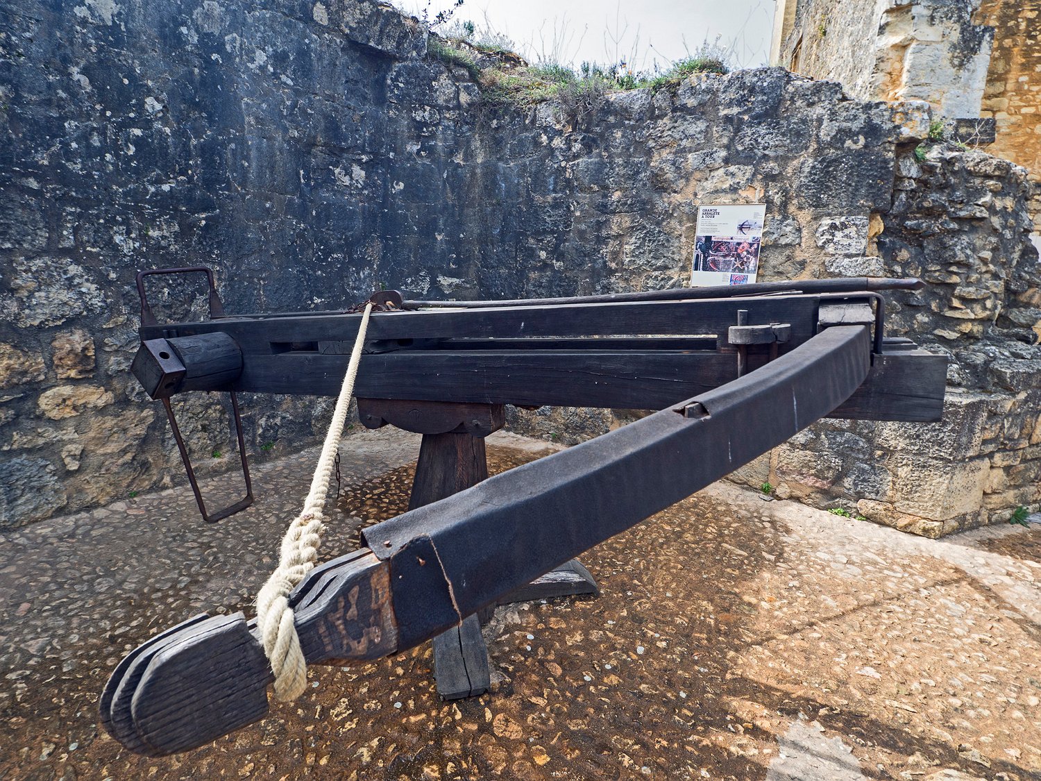 Sur le bastion- A partir du 1er plan : Perrière, mangonneau, trébuchet