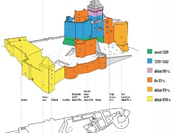 Image montrant l'état du château aujourd'hui et, en noir et blanc, au lancement de la restauration