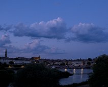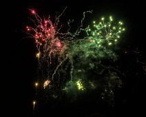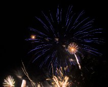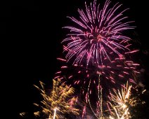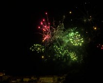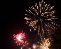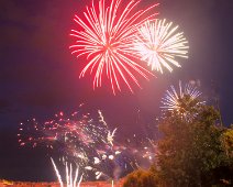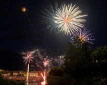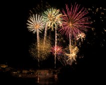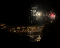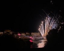 Le feu d'artifice de 2023 à Bergerac a été tiré depuis des barges flottantes sur la Dordogne au lieu de l'ile de la Pelouse. L'emplacement habituel pour prendre les photos s'est révélé moins approprié et un arbre en a masqué une partie.