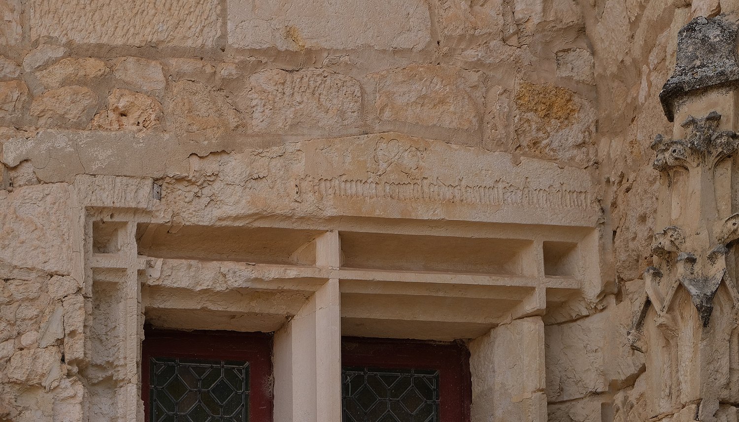 Inscription sur un linteau de fenêtre à gauche de la porte d'entrée
