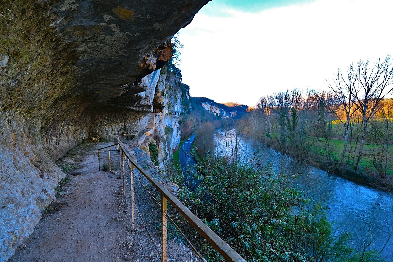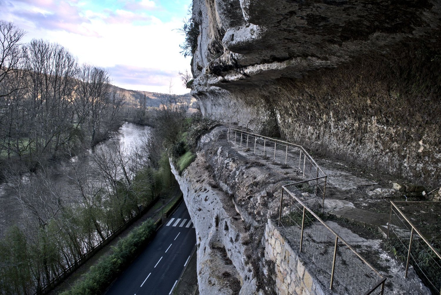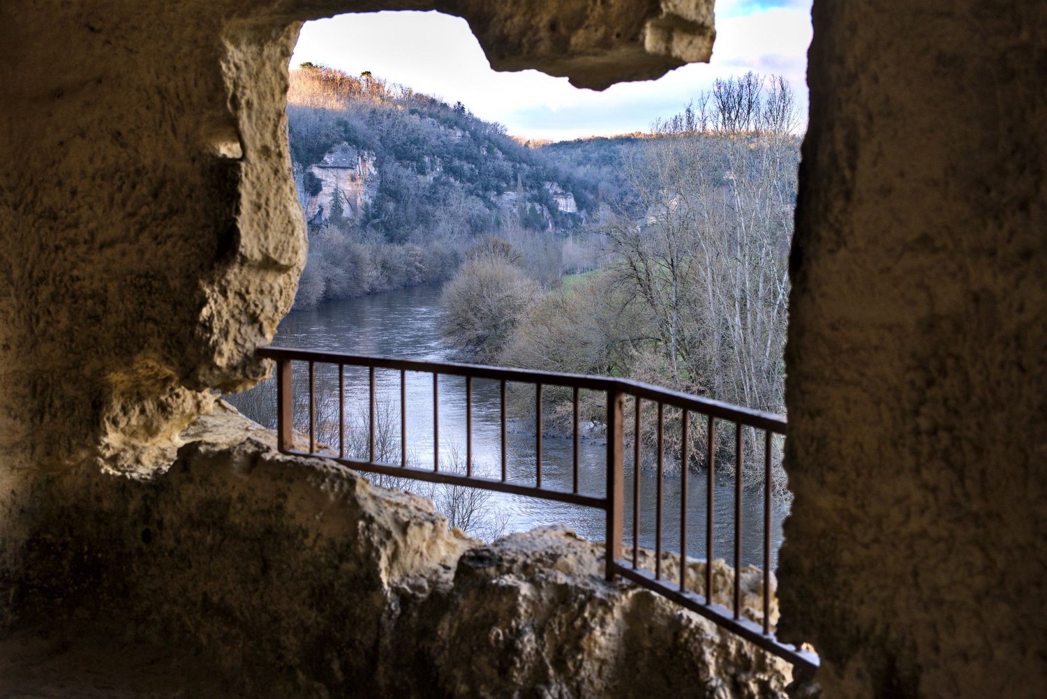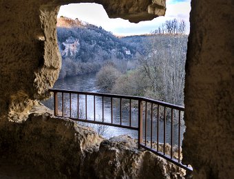 Vue sur la Vézère, les Eyzies et la terrasse du 1er niveau depuis l'entrée de la 1ère salle