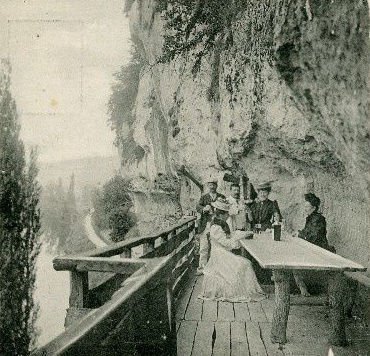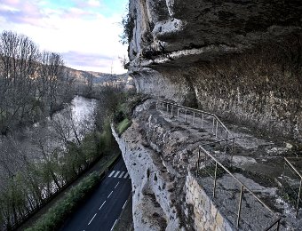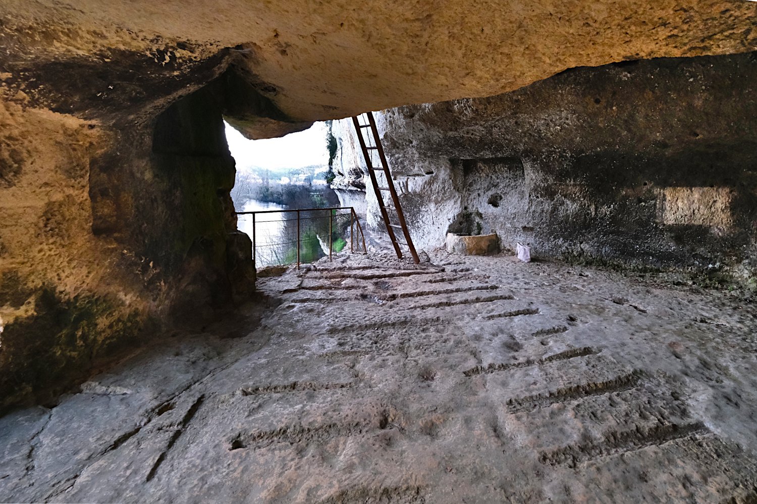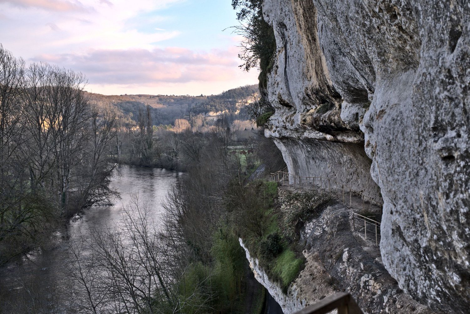 Vue sur la Vézère, les Eyzies et la terrasse du 1er niveau depuis l'entrée de la 1ère salle
