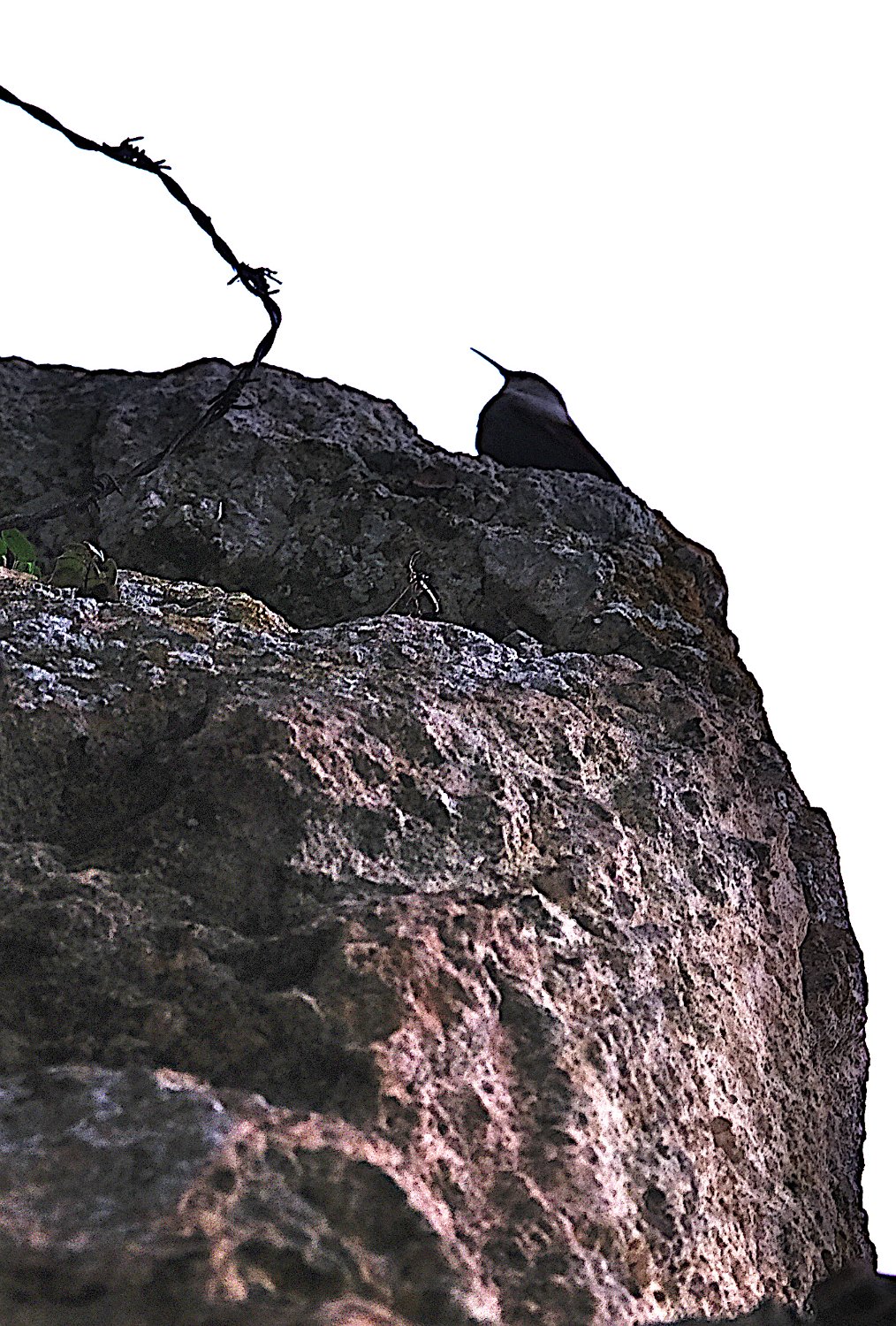 Vestiges de l'emplacement d'une toiture d'habitation («accent circonflexe» en haut à gauche de l'image) et de l'accroche d'un mur (rainure verticale en pointillé au 2/3 droit de l'image)
