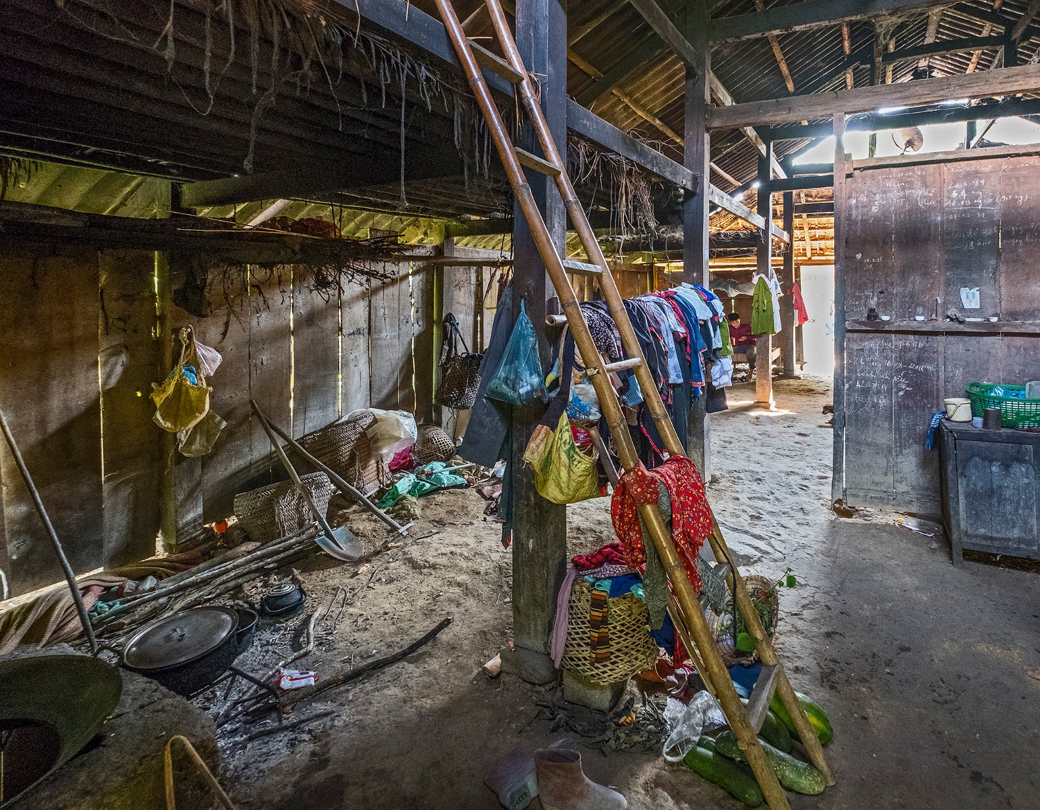 Intérieur d'une maison traditionnelle Dao. Au 1er plan à gauche le foyer destiné à la cuisson des aliments.